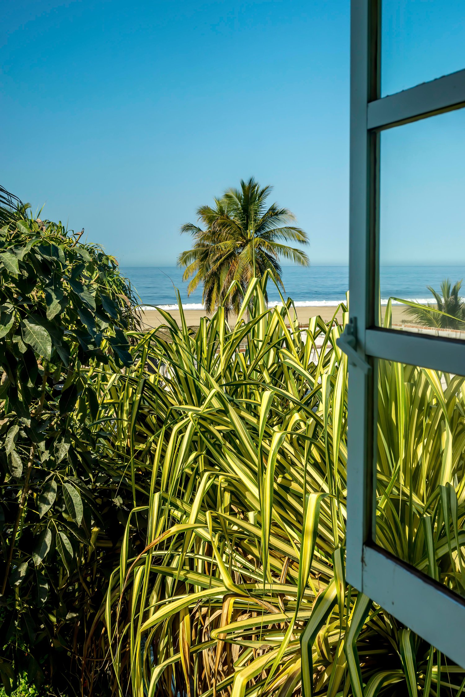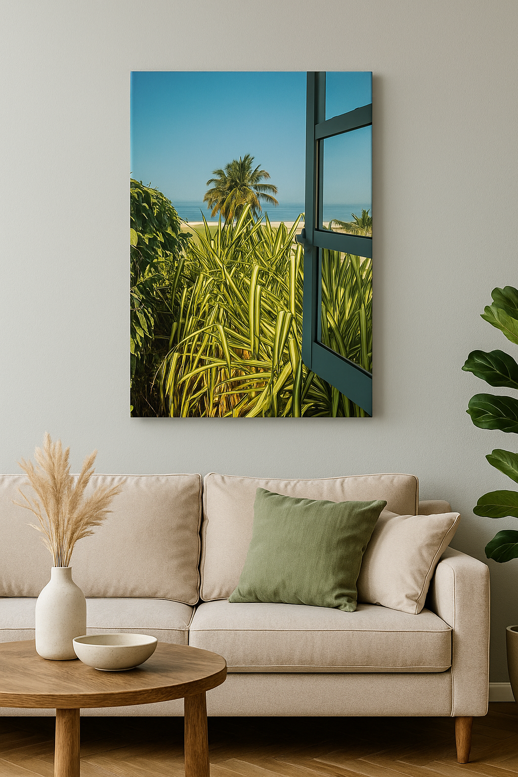 A peaceful tropical photograph capturing palm trees and ocean waves viewed through an open window. This vertical canvas wall art brings the calm of seaside mornings into your home, perfect for beach lovers or tropical decor themes. Ideal for bedrooms, coastal living rooms, or serene reading spaces. Available as a high-resolution digital download or canvas print.