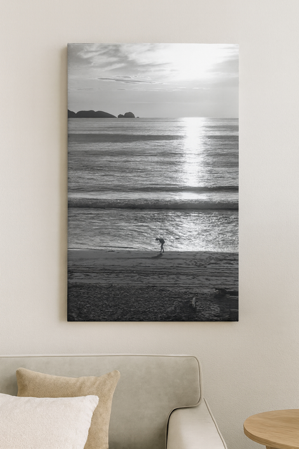 Capture the calm of the shoreline with this striking black and white photograph of a sunset over the ocean. Featuring a lone figure on the beach and the shimmering reflection of the sun, this digital download or canvas print adds timeless elegance to any home or office.