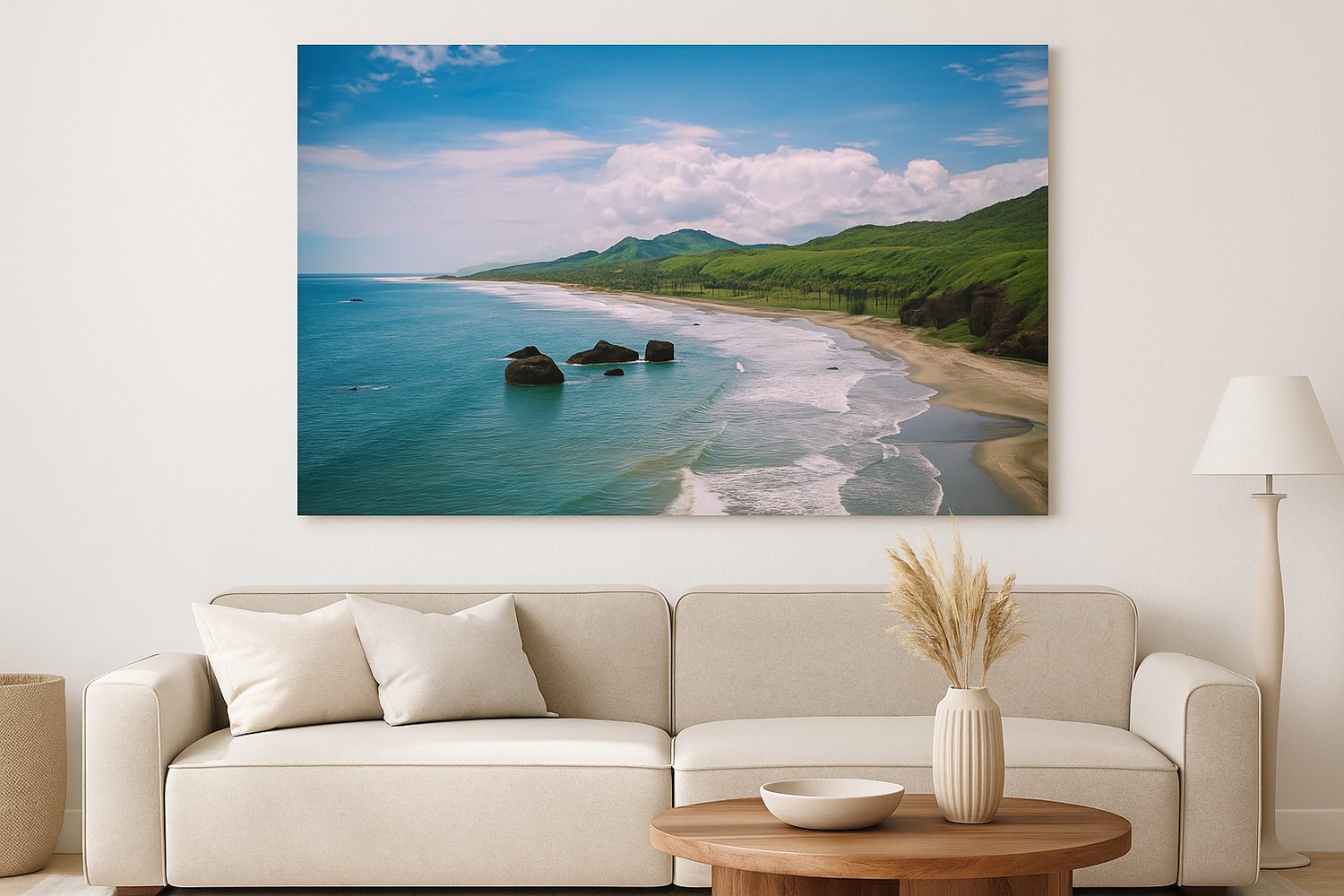 This breathtaking coastal photograph showcases the natural harmony between ocean, mountains, and tropical palms. The gentle curve of the shoreline, turquoise water, and rolling green hills create a sense of peace and wanderlust. Perfect for anyone who loves tropical escapes, this photo brings the beauty of the seaside into your home or office—ideal as a high-resolution digital download or premium canvas print.